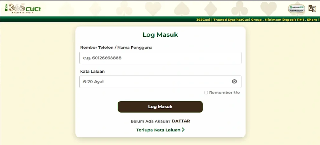 Registration at 365CUCI takes about 2 minutes. Click “Register” on the homepage, enter your personal details (name, birth date, phone, email), create login credentials, and select your preferred currency (MYR). Verify your phone via SMS, and your account becomes immediately active for deposits and play.