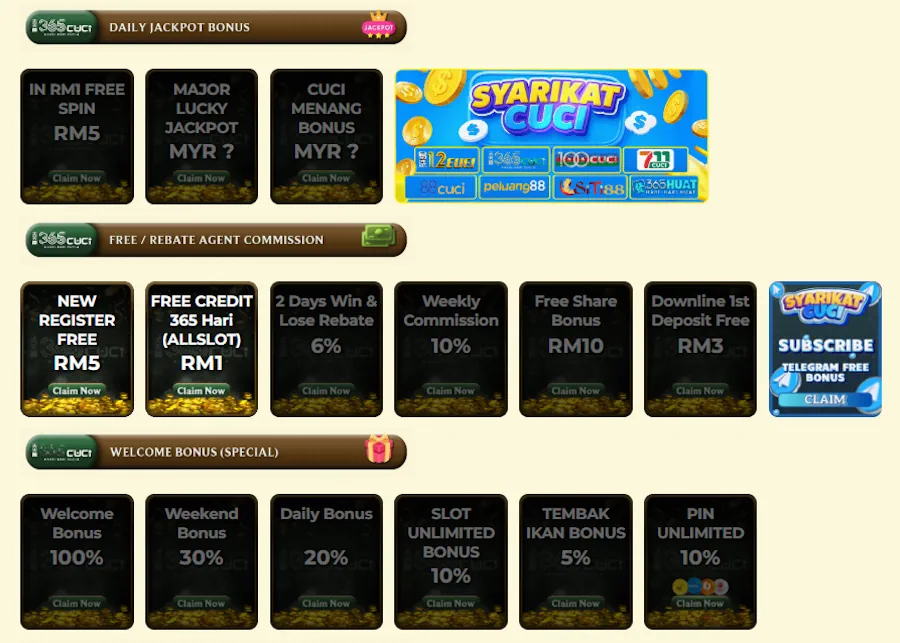 365CUCI offers several free credit opportunities, including an RM18 no-deposit bonus for new registrations, periodic reload free credits (typically RM10-30), birthday free credits for registered players, and referral bonuses when you invite friends. These free credits usually carry 15x wagering requirements.
